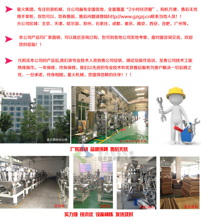 該全自動薯片薯條包裝機為星火研制的多頭組合稱包裝機,專業(yè)包裝薯片薯條、貓耳朵等膨化食品而研制,故又稱膨化食品自動包裝機械。整機自動化程度高,全自動完成送料,計量,充填制袋,打印日期,產品輸出全部生產過程,十頭電腦組合秤,計量精度高、效率快,不易碎料,包裝形式多樣:背封、插角、連袋、沖孔等。 1.4230全自動包裝機 2.十頭電腦組合秤 3.Z型物料輸送機 4.振動送料機 5.支撐平臺 6.成品輸送機 ![]() 1、采用雙伺服電機控制,拉膜更準確,速度更快。 3、橫、縱封溫度獨立控制,能良好的適用各種復合膜、PE膜等包裝材料。 4、精度高、噪音小。