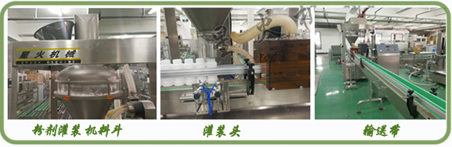 其中粉劑灌裝機(jī)采用了先進(jìn)的PLC+伺服馬達(dá)+觸摸屏等先進(jìn)模式,整套設(shè)備性能穩(wěn)定、精度高,全不銹鋼結(jié)構(gòu),整個(gè)灌裝過(guò)程采用了智能的控制系統(tǒng),能完成瓶子自動(dòng)定位、充填及計(jì)量等工作,他由一個(gè)充填頭、一臺(tái)鏈板輸送帶及一個(gè)定位裝置組成,是一款經(jīng)濟(jì)實(shí)用的粉末及小顆粒自動(dòng)灌裝機(jī)。另外該套設(shè)備配有位置合理的高度調(diào)節(jié)手輪 ,方便調(diào)整機(jī)頭高度。其配套裝置包括:氣動(dòng)閥門(mén)裝置、防漏離心裝置、托罐裝置、水平開(kāi)啟式料箱、在線稱重計(jì)量裝置、除塵裝置