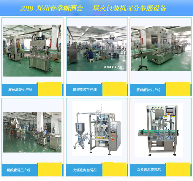 據(jù)悉2018年鄭州糖酒會(huì)劃分酒類與包裝展區(qū)、特色黃酒展區(qū)、國際葡萄酒展區(qū)、高端食品飲料展區(qū)、綜合食品飲料展區(qū)(室外)、食品包裝技術(shù)與加工設(shè)備展區(qū);星火包裝機(jī)也申請(qǐng)到了特展展位,將為大家?guī)硪后w灌裝生產(chǎn)線、膏體灌裝生產(chǎn)線、醬料灌裝生產(chǎn)線、粉體灌裝生產(chǎn)線、顆粒灌裝生產(chǎn)線、自動(dòng)給袋包裝機(jī)、火鍋底料全自動(dòng)包裝生產(chǎn)線等設(shè)備