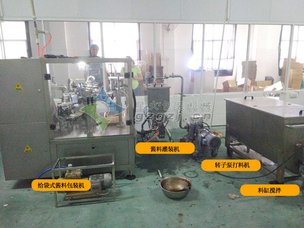 甜辣醬包裝機(jī)成不少調(diào)味醬生產(chǎn)企業(yè)標(biāo)配 甜辣醬、刷刷醬等幾乎都成為燒烤、火鍋、西餐的標(biāo)配。從生產(chǎn)企業(yè)來看,多數(shù)企業(yè)采用自動(dòng)包裝機(jī)實(shí)現(xiàn)了調(diào)味醬生產(chǎn)的自動(dòng)化、智能化。今天,以我們近期的客戶-徐州青創(chuàng)食品為例,帶您了解下有哪些設(shè)備在背后推動(dòng)調(diào)味醬的智能化生產(chǎn) 徐州青創(chuàng)食品有限公司是一家致力于火鍋底料及蘸料的生產(chǎn)企業(yè);對(duì)于其產(chǎn)品的包裝過程主要要求物料均勻、包裝密封性好、圖案完整;我們在甜辣醬包裝機(jī)前端為其配置了單獨(dú)的料缸攪拌機(jī),這是保證大顆粒粘稠物料不沉淀的第一步;其后通過轉(zhuǎn)子泵打料機(jī)交由醬料灌裝機(jī)再次攪拌;給袋式醬料包裝機(jī)作為最后的包裝工序也是最關(guān)鍵的,它的封口效果直接決定了調(diào)味醬的保質(zhì)期;為此,我們標(biāo)配有光電跟蹤設(shè)置,對(duì)包裝袋的封口位置、溫度等進(jìn)行監(jiān)控和調(diào)節(jié);